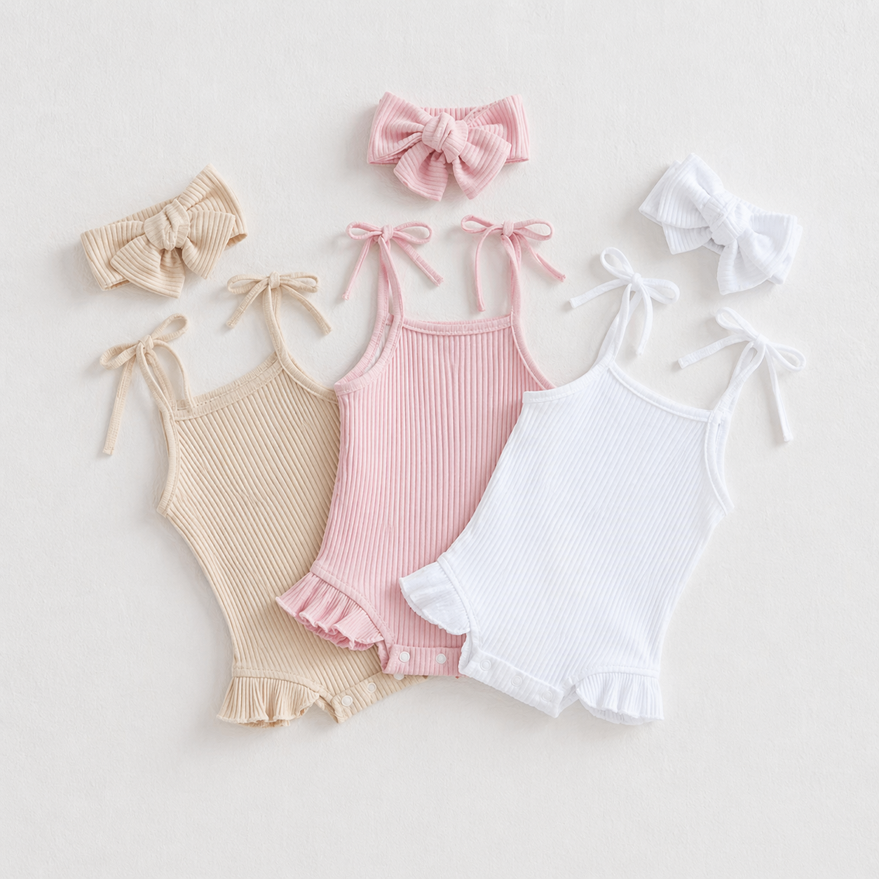 Effortlessly sweet from day one. A soft ribbed romper with tie shoulders and a flutter hem paired with a matching bow headband for the complete look.