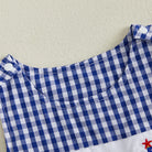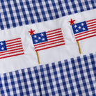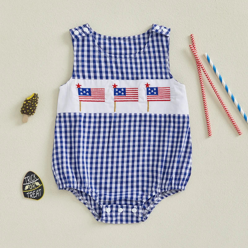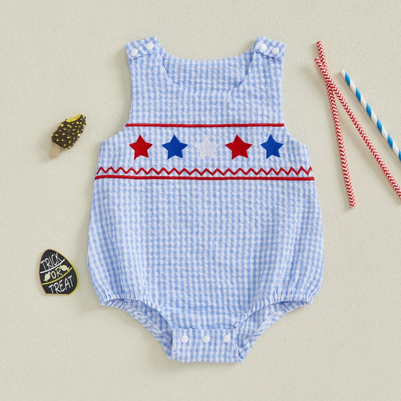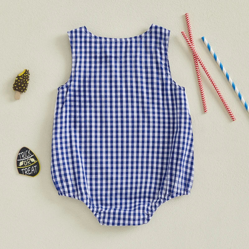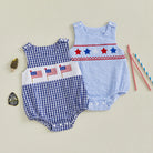 The All-American Star Romper is a timeless summer staple, featuring classic gingham fabric paired with charming embroidered American flag details across the chest.