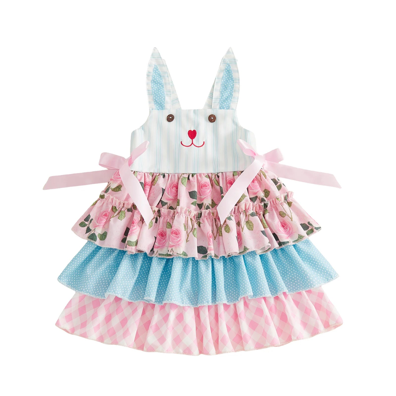 Sweet, playful, and made for magical spring moments. Our Sweet Bunny Garden Dress features an adorable bunny-inspired bodice with charming embroidered details and playful bunny ears that add a whimsical touch. The tiered skirt combines soft floral prints, pastel patterns, and delicate textures for a dress that feels both timeless and joyful. Designed with soft, breathable fabric and comfortable stretch smocking in the back, this dress keeps little ones comfortable while looking picture-perfect for Easter celebrations, spring photos, and special family moments. A delightful boutique piece made for little memories and big smiles.