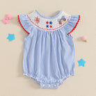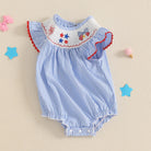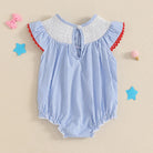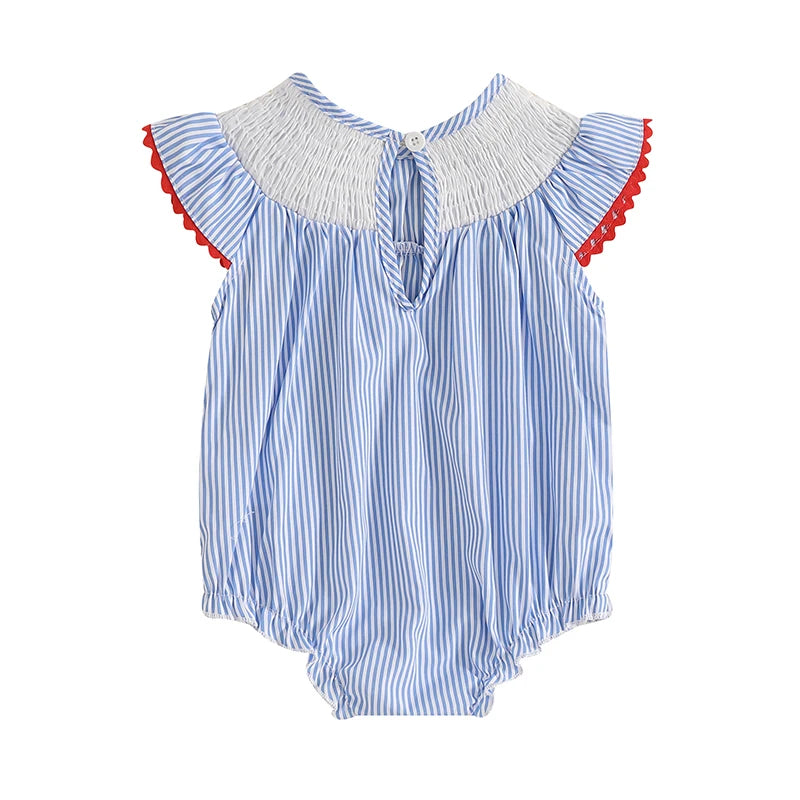 Celebrate summer in the sweetest way with our Starry Bow Smocked Bubble Romper. Featuring classic blue-and-white stripes, hand-smocked patriotic embroidery, and flutter sleeves, this romper is perfect for holidays, photos, and everyday play. Designed for comfort, easy changes, and timeless charm.