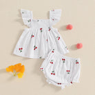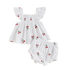 Sweeten up your little one’s summer wardrobe with our Cherry Blossom Flutter Set. This adorable 2-piece outfit features a smocked flutter-sleeve top and matching bloomers, adorned with delicate cherry embroidery. Crafted from soft, breathable fabric with subtle vertical texture, it's designed to keep your baby cool and comfy all day. Perfect for sunny days, picnics, and photo ops!