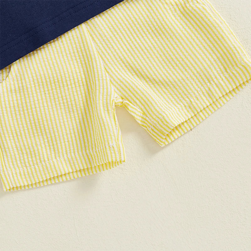Designed for busy little builders and big adventures, the Little Builder Summer Set is the perfect warm-weather outfit for play, outings, and everyday fun. This two-piece set features a soft navy tee with an adorable construction vehicle embroidery and lightweight yellow striped shorts with a comfy elastic waistband. It’s breathable, flexible, and made for nonstop movement without sacrificing style.