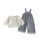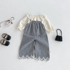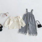 Your little one will look effortlessly chic in our Little Paris Two-Piece Set. This charming outfit pairs a lightweight cream blouse with delicate lace-trimmed ruffles and wide-leg black-and-white gingham overalls for a boutique-inspired look parents love.