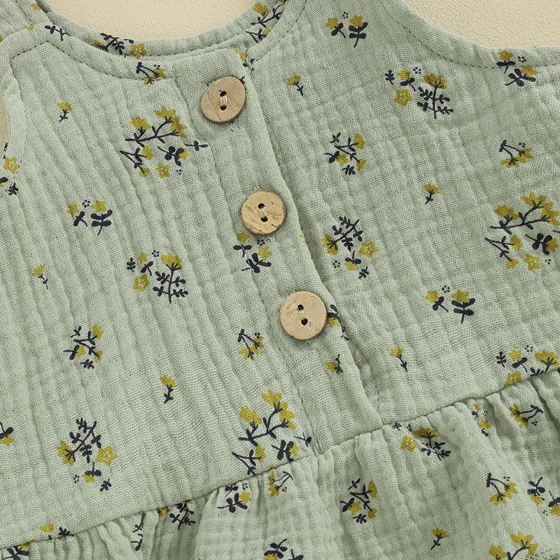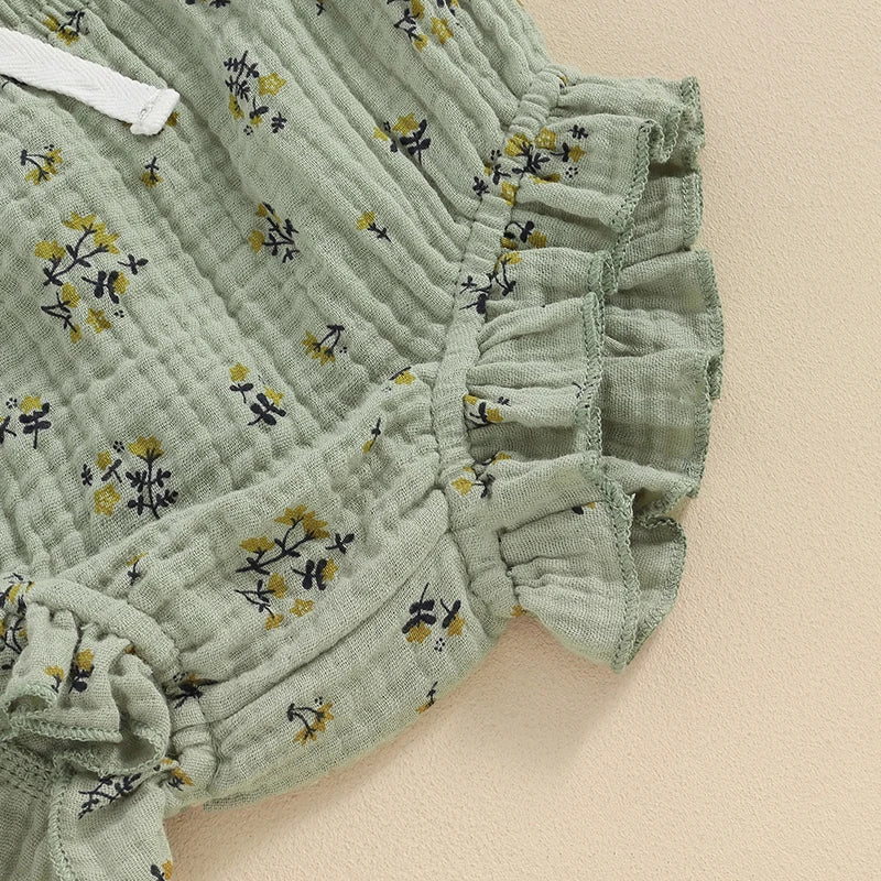 Soft, breathable, and thoughtfully designed for everyday sweetness, the Petite Meadow Set is a two-piece outfit made for little ones on the move. Crafted from lightweight muslin cotton, this set features a gently peplum-style top with delicate wooden buttons and matching ruffle-trim shorts for an effortlessly charming look.