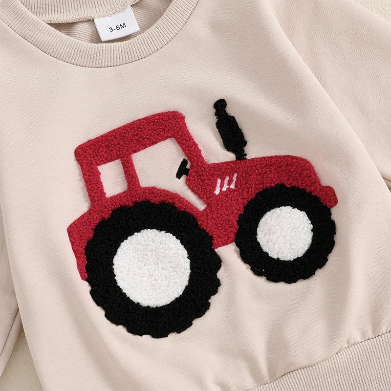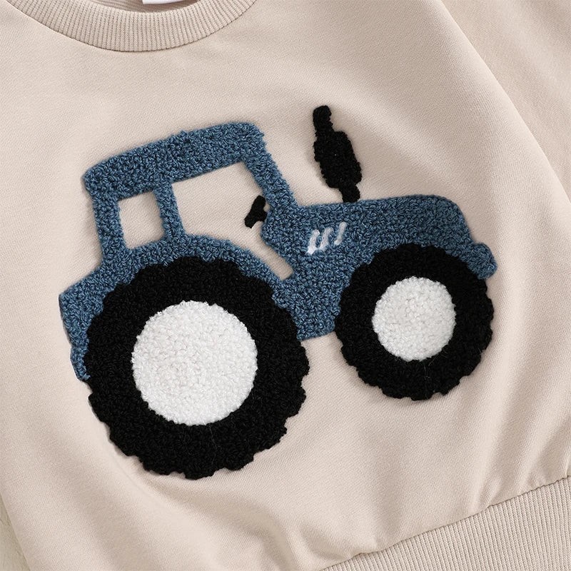 Meet The Little Harvester Lounge Set a cozy, playful outfit designed for curious little ones who love to explore. Featuring a soft sweatshirt with textured tractor embroidery and matching jogger-style pants, this set blends everyday comfort with charming detail.
