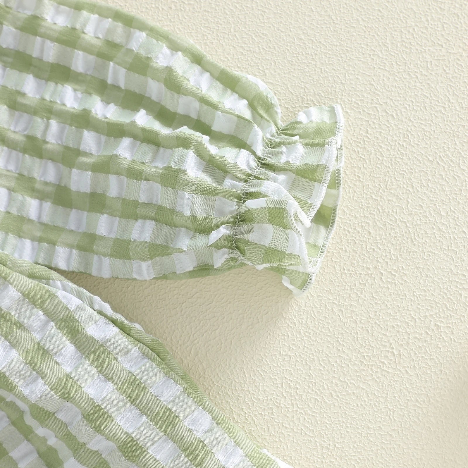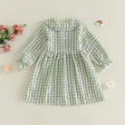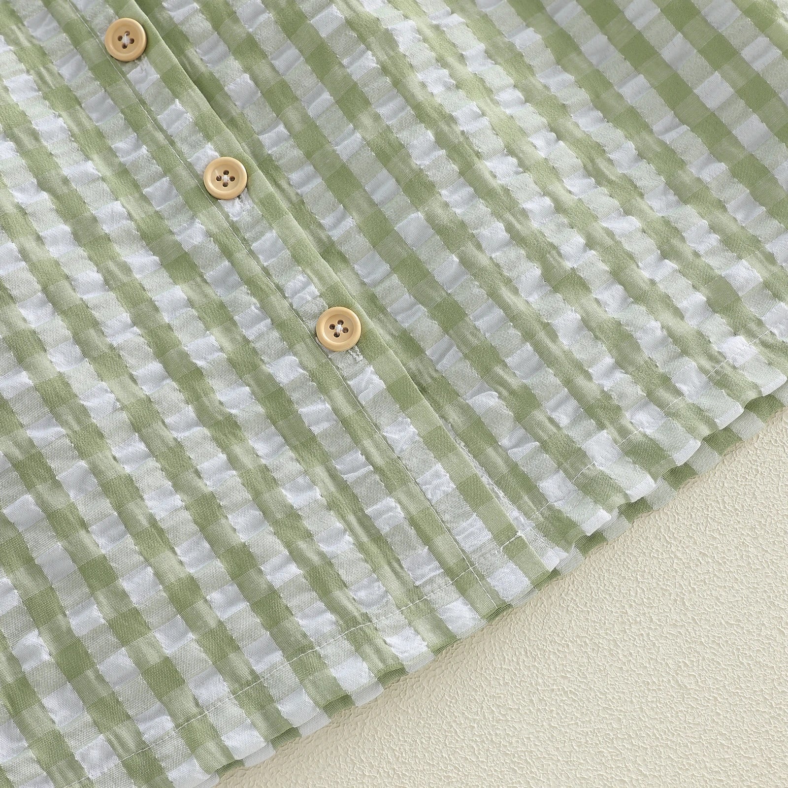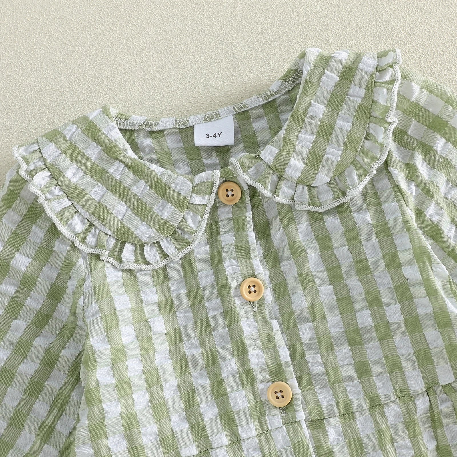 The Meadow Bloom Dress is a classic, storybook-inspired piece designed for comfort, charm, and everyday wear. Made with lightweight, breathable seersucker fabric, this dress keeps your little one cool and comfy while looking effortlessly adorable. Featuring a delicate ruffle Peter Pan collar, natural wooden buttons, and softly gathered sleeves, this dress is perfect for playdates, family photos, school days, and seasonal celebrations.