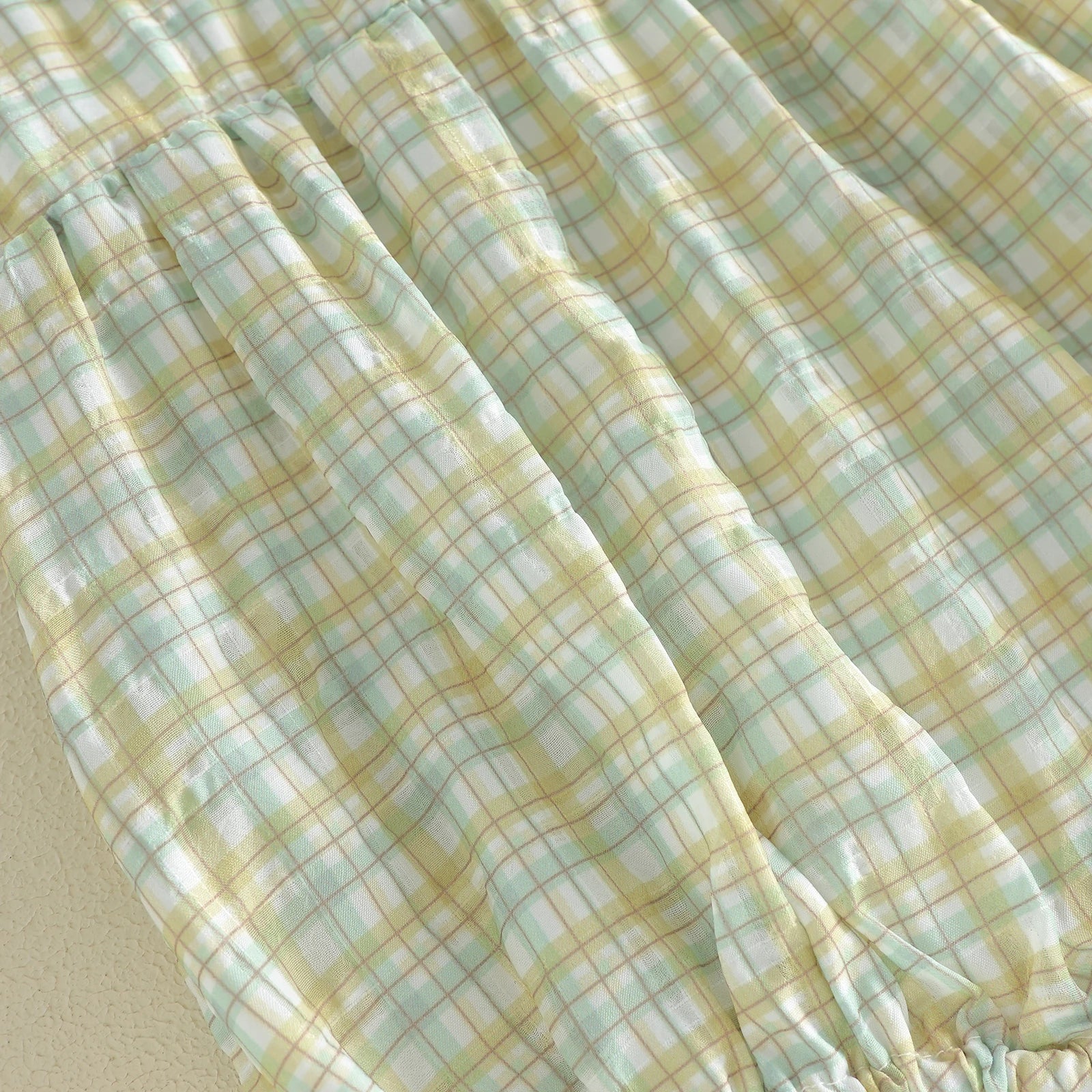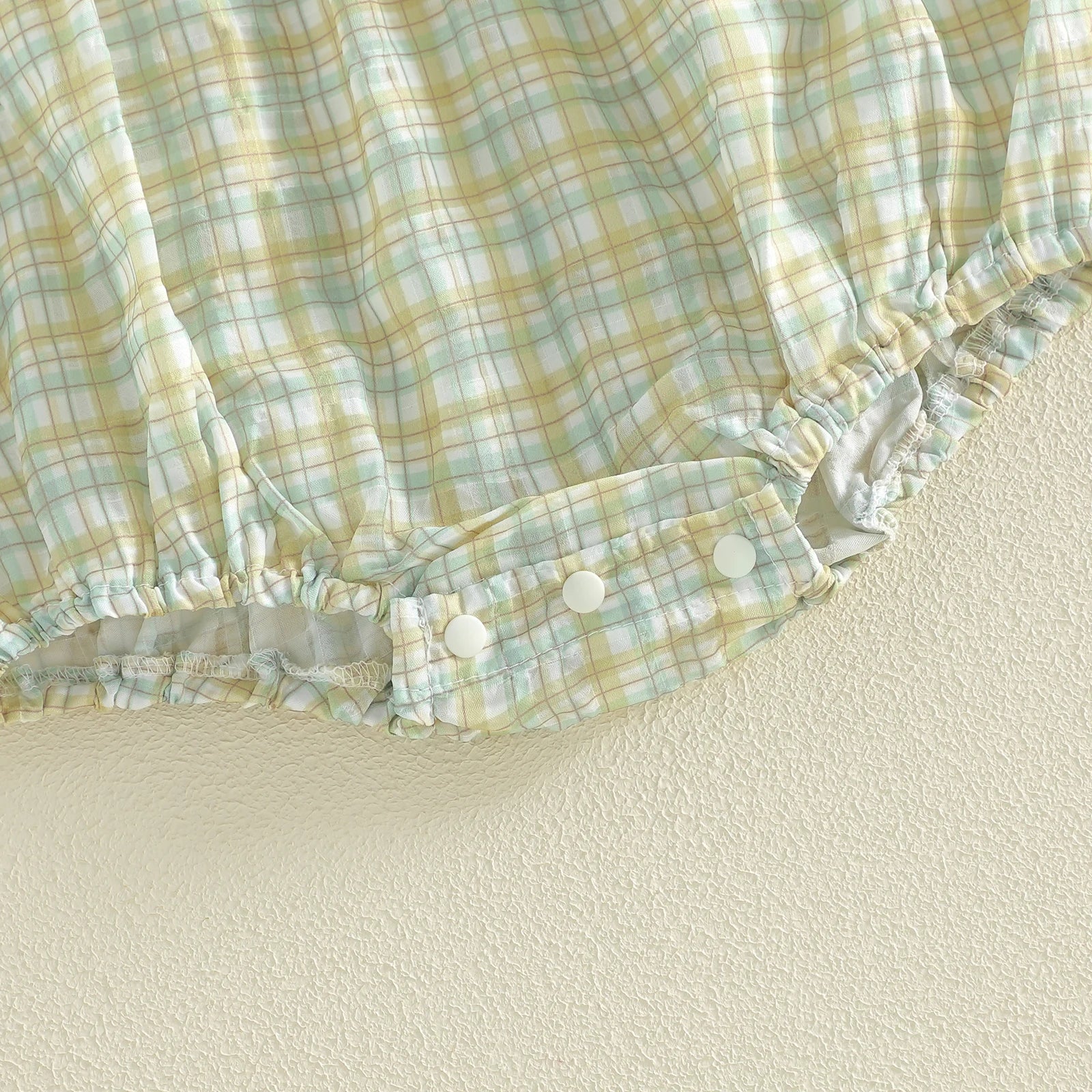 Soft, airy, and effortlessly charming. The Meadow Light Bubble Romper brings a delicate vintage feel with its pastel plaid pattern and sweet floral strap details. Designed with a breezy silhouette and gentle gathers, it offers both comfort and elegance for warm, sunlit days. Lightweight and breathable, this romper is perfect for everyday wear, special outings, and those quiet, picture-perfect moments. Simple beauty, thoughtfully designed.