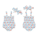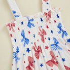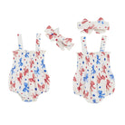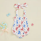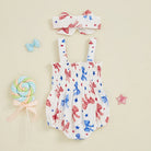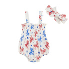 Celebrate summer in star-spangled style with this adorable 2-pack romper set! Featuring playful red, white, and blue prints with patriotic bows and American flags, each romper is made from lightweight, breathable cotton blend for all-day comfort. The smocked bodice, adjustable straps, and matching headbands make these a go-to choice for 4th of July parades, backyard BBQs, and family photos.