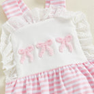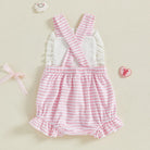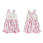 Wrap your little one in timeless charm with our Sweet Pea Romper Is a delightful blend of softness and style for babies 3–18 months. Featuring a classic pink-and-white stripe pattern, dainty bow embroidery across the chest, and delicate lace-trimmed ruffle straps, this romper was made to steal hearts. The crisscross back design ensures a secure fit, while the ruffled leg openings and bottom snap closures make diaper changes a breeze.